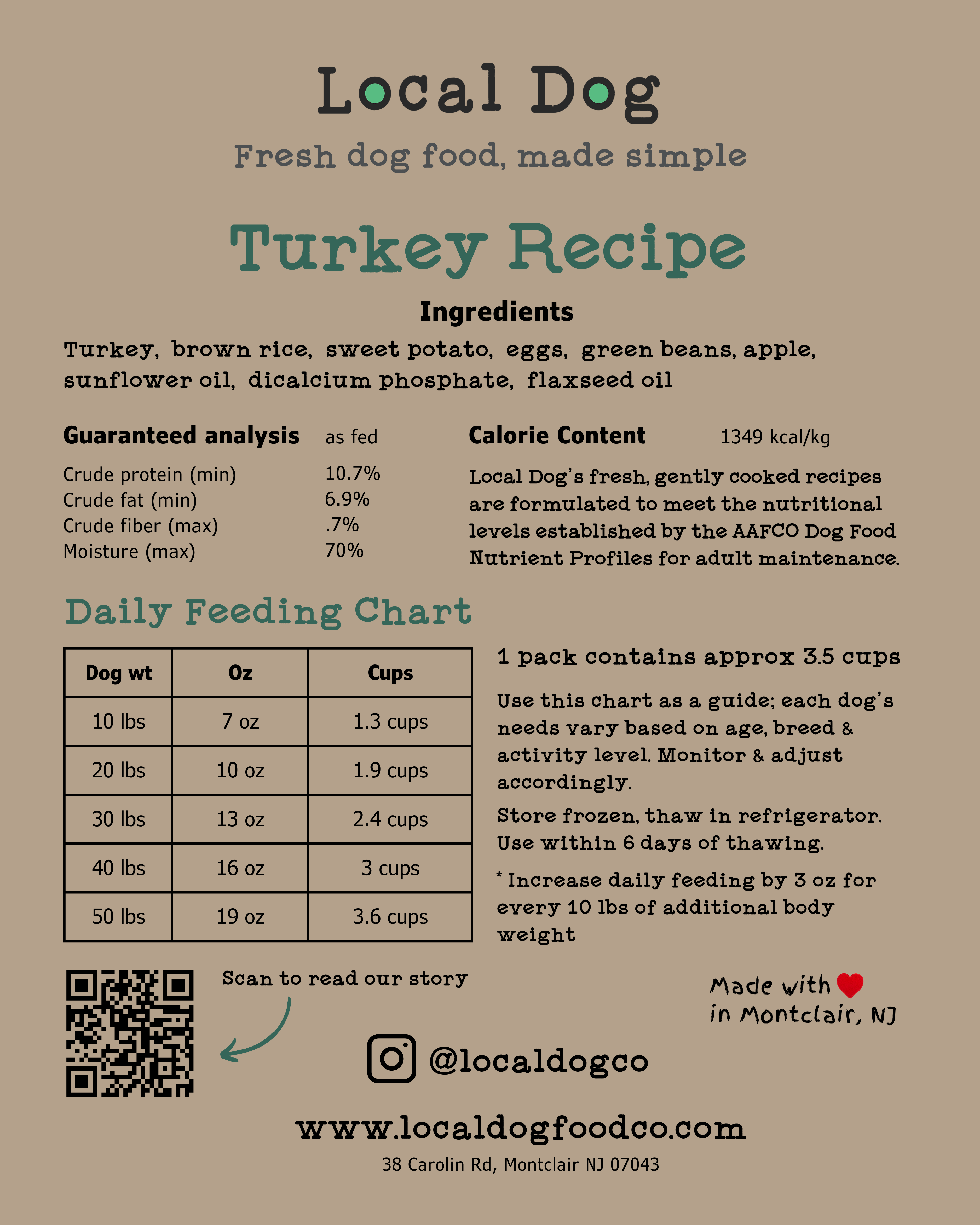 Our turkey recipe is high in protein and carefully balanced to provide your dog with all the necessary nutrition to live their best dog life. We haven't met a dog that doesn't devour this recipe the second it hits their bowl.